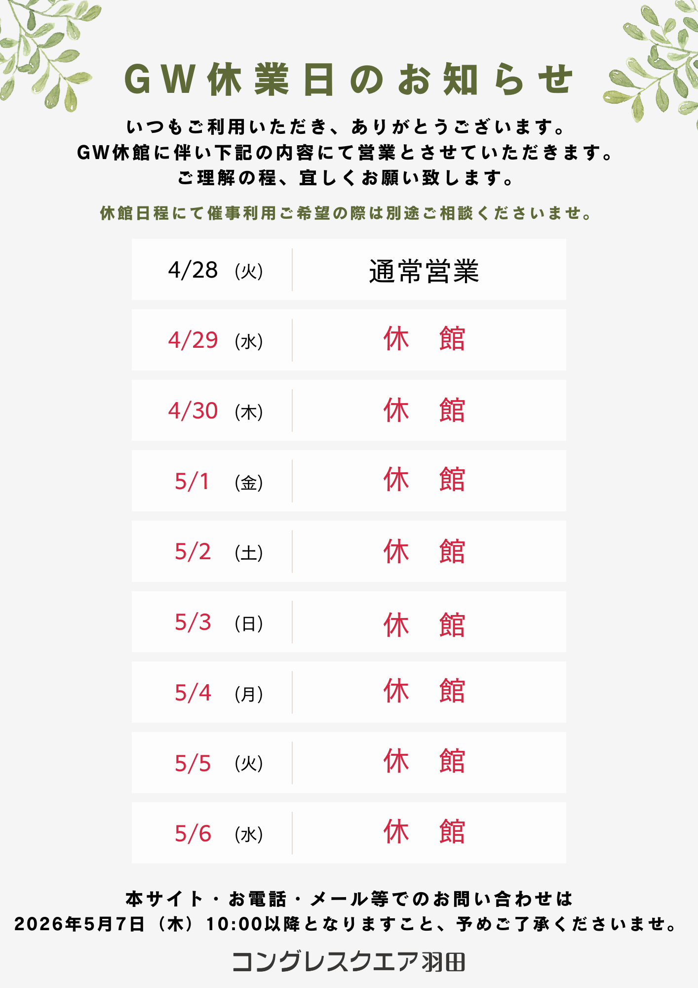 コングレスクエア羽田は2026年4月29日(水)から5月6日(水)までGW休館とさせていただきます。